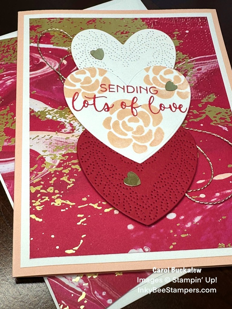 Below is a list of products used to create today’s project. The Hearts of Elegance Bundle (Item #164916), Marbled Elegance 12″ x 12″ Specialty Designer Series Paper (Item #164919), Gold Twisted Thread (Item #164603) and Adhesive-Backed Heart Sequins (Item #164920) will be available in the online store on November 5.