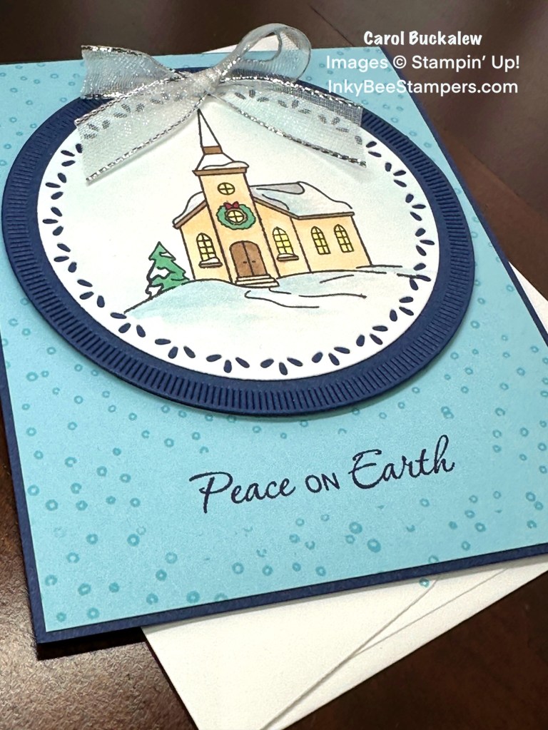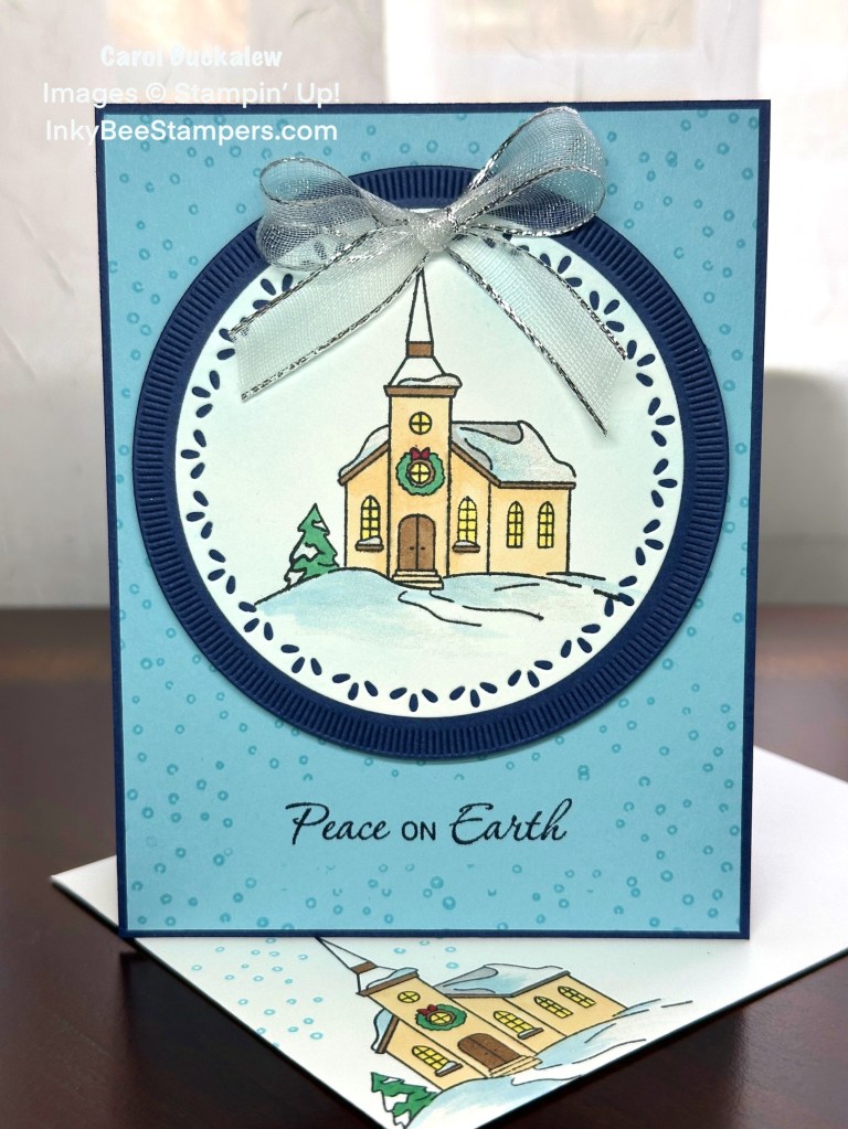 I used the leaf detail circle from the Spotlight on Nature Dies to cut out the church image and a larger circle was die cut from Night of Navy cardstock using the same Die set. The white stamped and colored circle was adhered to the larger Night of Navy Circle then this was adhered to the top of the card front using Stampin’ Dimensionals.