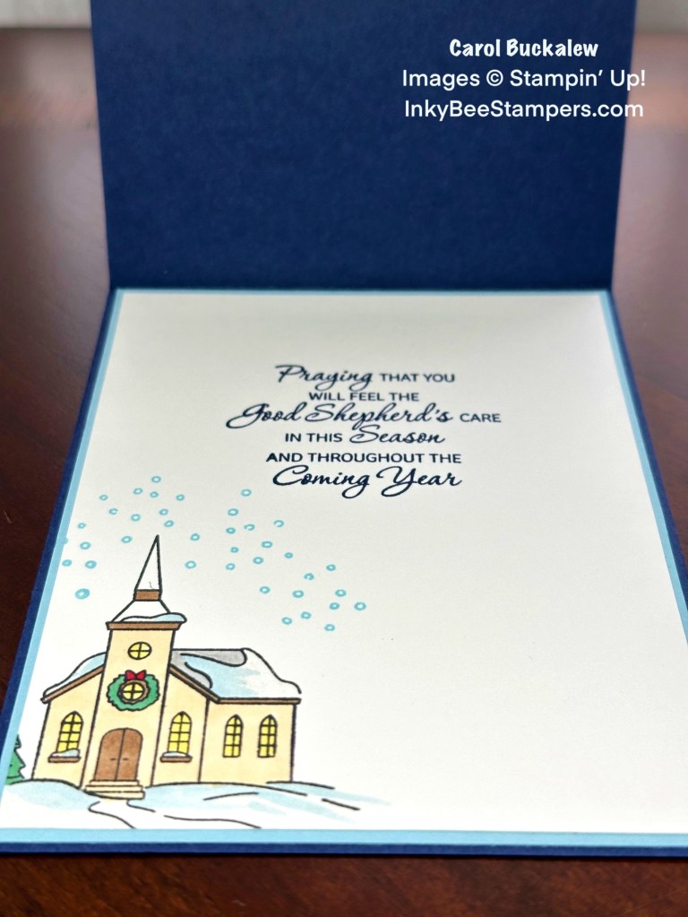 I stamped an additional sentiment from the Shepherd’s Care Stamp Set onto the inside panel in Night of Navy ink. The church image from the Yuletide Village Stamp Set was stamped onto the lower corner of the panel in Tuxedo Black Memento Ink. I then colored in the image using Stampin’ Blends. Snow was stamped around the church in Balmy Blue ink. The panel was adhered to a Balmy Blue mat, then adhered to the inside of the card.