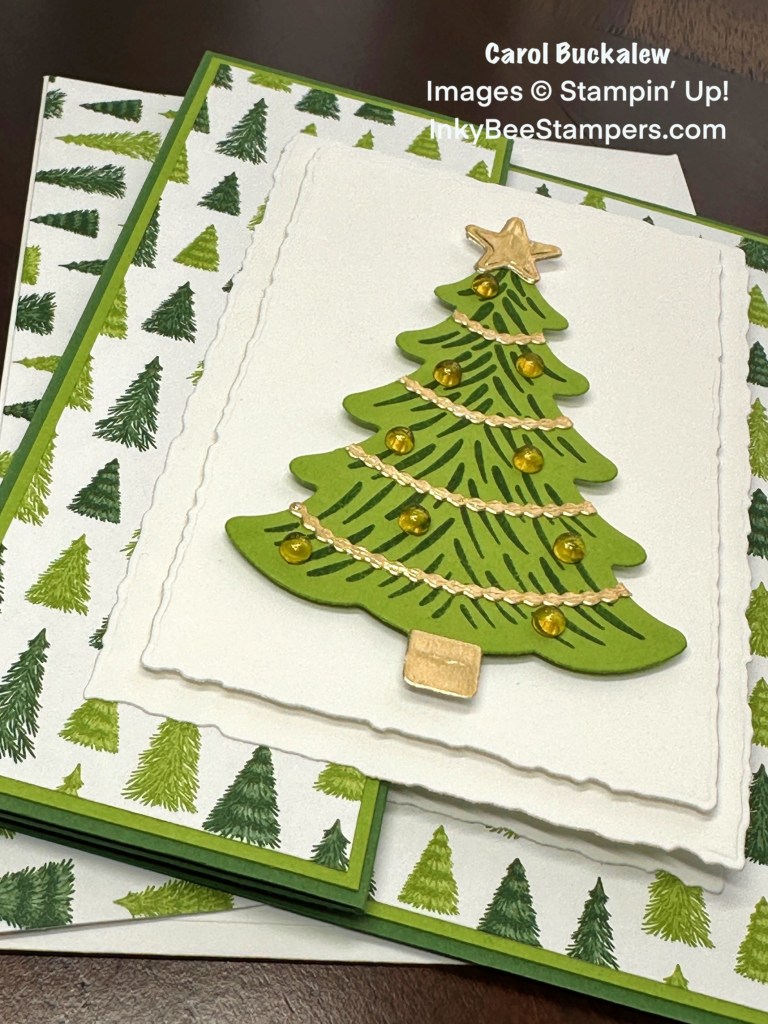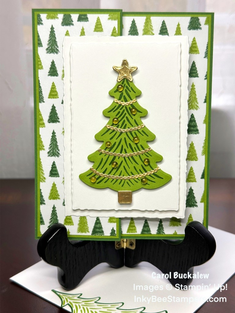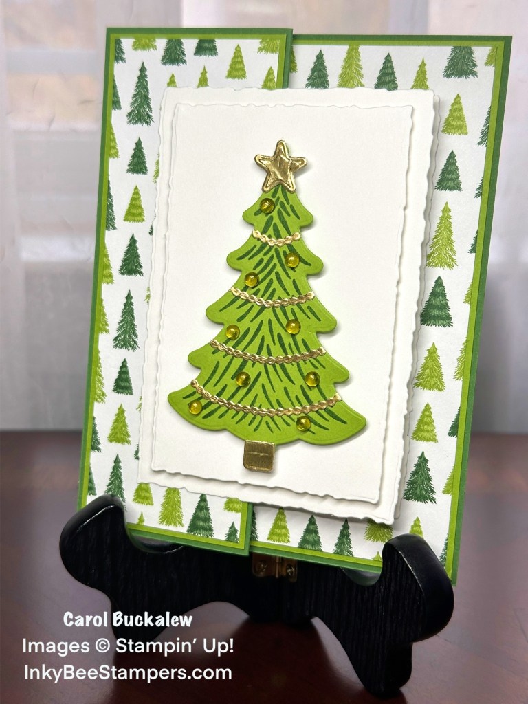 The pine branch image was stamped in Garden Green ink onto a piece of Granny Apple Green cardstock then I used the tree outline die from the Decorative Trees Dies to cut out the image. From Gold Foil I die cut the tree trim, star and tree trunk. These were adhered to the die cut tree. The tree was then adhered and centered onto the small die cut white rectangle using Stampin’ Dimensionals. Then this panel was adhered to the larger rectangle on the card front using Stampin’ Dimensionals.