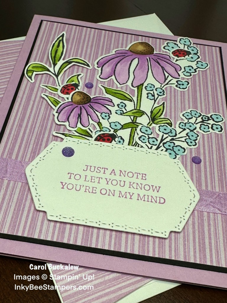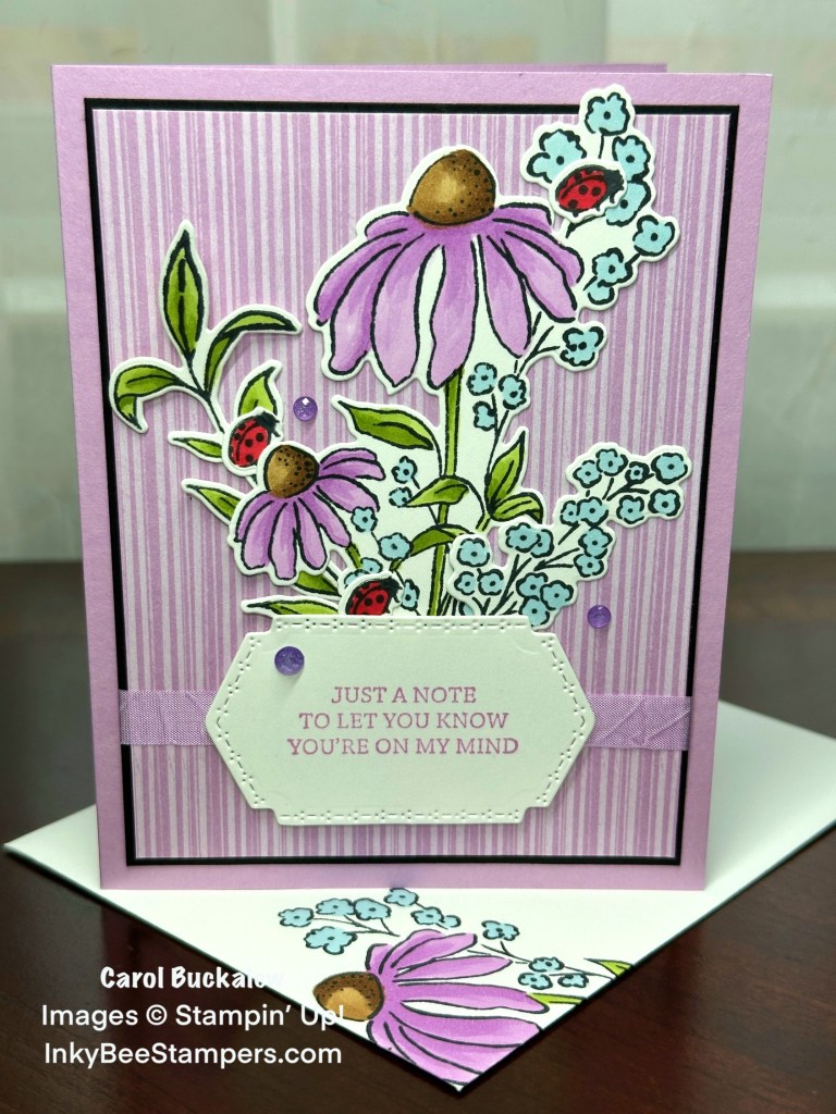 The Mixed Floral Stamp Set contains some beautiful floral images. I stamped the Coneflowers, Baby’s Breath, leaf sprig and Ladybugs in Tuxedo Memento Black ink onto white cardstock then colored the images in using a variety of Stampin’ Blends. Check out those sweet Ladybugs! I then used the coordinating dies from the Mixed Floral Dies to cut out the images. I used the Mixed Labels Stamp Set for the sentiment on the card front and then cut out the sentiment using this pretty label die from the Mixed Labels Dies set.