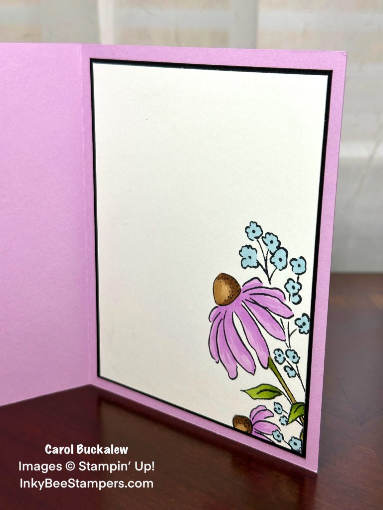 On the inside panel, I partially stamped the Coneflower image onto the lower right corner of the panel then colored the image using Stampin’ Blends. The panel was adhered to a black mat, then adhered to the inside of the card.