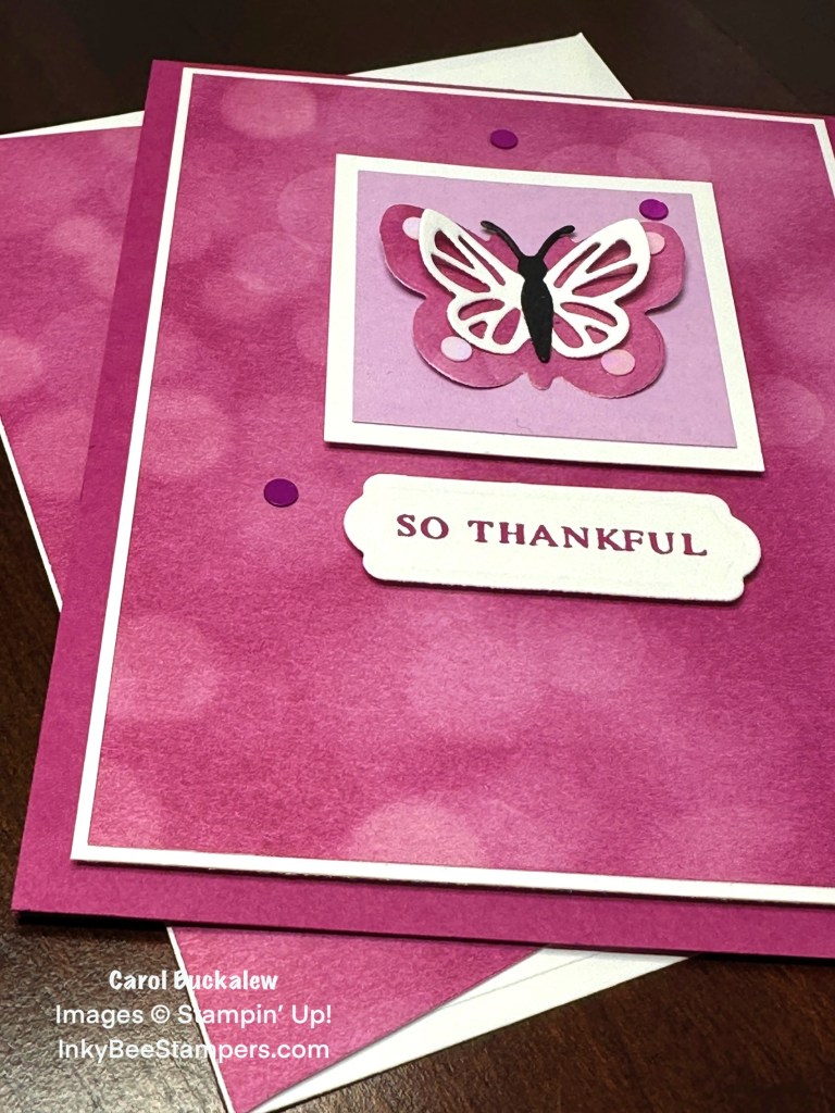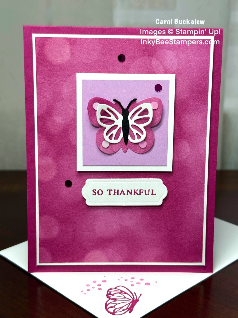 Here is another sneak peek of products coming on January 7! I used the Beautiful Butterflies Bundle (which includes a stamp set, dies and a hybrid embossing folder) and the Beautiful Bokeh 6″ x 6″ Designer Series Paper. Not sure what to create? No problem! I cased this card from the January-April 2025 Mini Catalog. And I put my own twist on the card as well!