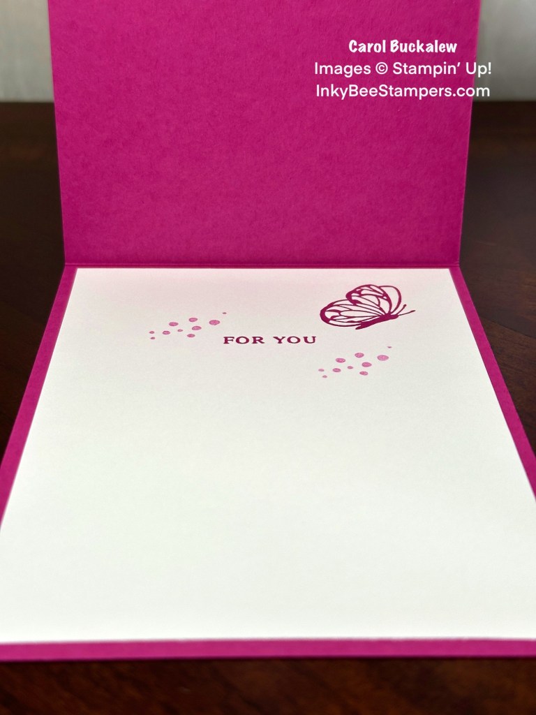 The “For You” sentiment was stamped onto the inside panel in Berry Burst ink, then I stamped the small butterfly image just above the sentiment to the right in Berry Burst ink. I then second-generation stamped the dotted image around the sentiment and adhered the panel to the inside of the card.