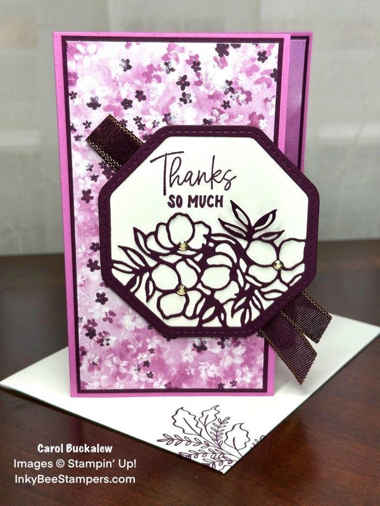 Using the Memorable Blooms Dies, I die cut a white octagon using the largest octagon die from the set. I then used both octagon dies to cut out the Blackberry Bliss floral octagon frame. The Blackberry Bliss octagon frame with then placed on top of the white octagon and I stamped the sentiment above the floral cutouts in Blackberry Bliss ink. The Blackberry Bliss octagon frame was then adhered to the white octagon using small drops of liquid glue. I adhered a length of the Blackberry Bliss & Gold Textured Ribbon to the card front diagonally using a small amount of Stampin’ Seal, then the octagon unit was adhered to the front of the card using Stampin’ Dimensionals.