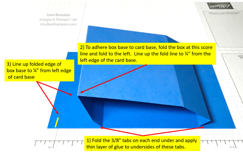 Before adhering the box base to the card base, I first adhered Snowflake Specialty Vellum panels to the three sections on the box base. I folded the tabs on each end of the box base under and applied a thin line of glue to each tab. The box base is then folded at the 1-3/8″ score line and I lined up this folded edge 1/4″ from the left side of the card base, then flattened the box base and adhered it to the card base.