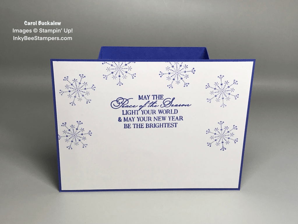 Since this card does not open like a traditional card, a panel was added to the back of the card. I stamped an additional sentiment from the Brightest Glow Stamp Set onto a Basic White cardstock panel measuring 5-3/8″ x 4-1/8″. The medium-sized snowflake from the Christmas Lights Stamp Set was stamped in Orchid Oasis ink around this sentiment and the panel was adhered to the back of the card.